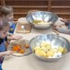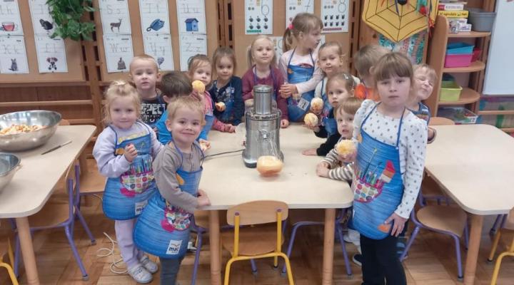 Dnia 09.10.2025 dzieci z grupy Misie przyniosły warzywa i owoce z których zrobiły przepyszną sałatkę jarzynową oraz zdrowe soki. Misie były szczęśliwe, że mogły zabawić się w kucharzy.
