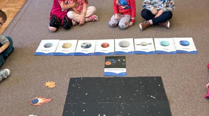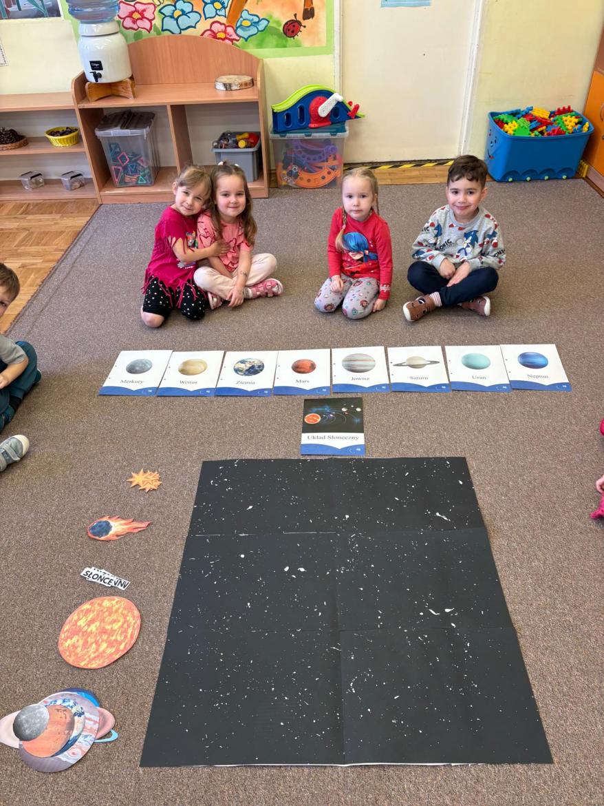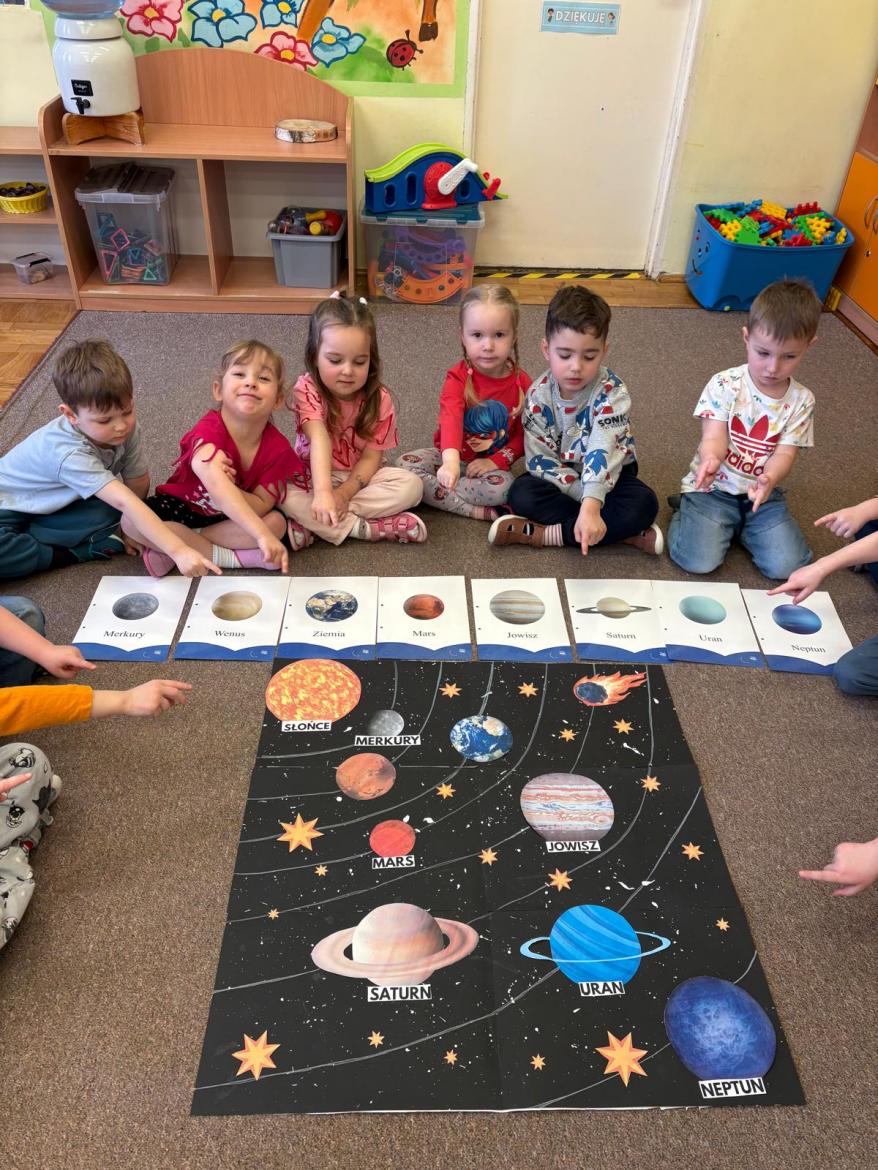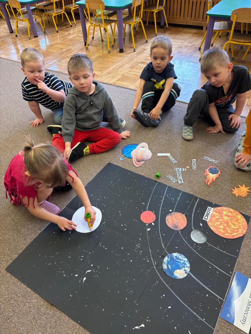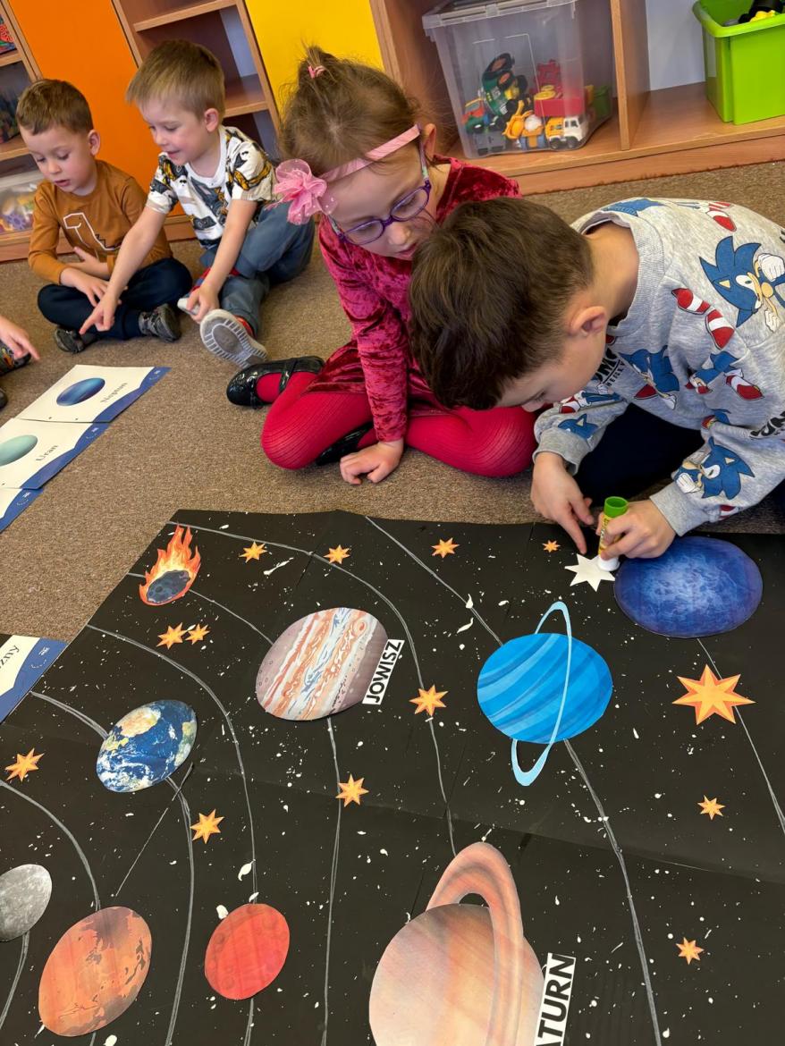 To był kosmiczny tydzień. Podczas zajęć dzieci wzbogacały wiedzę na temat Układu Słonecznego. Poznały pojęcia związane z kosmosem tj. planeta, orbita, kosmonauta, rakieta. Wykonaliśmy wspólną pracę „…