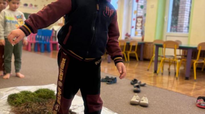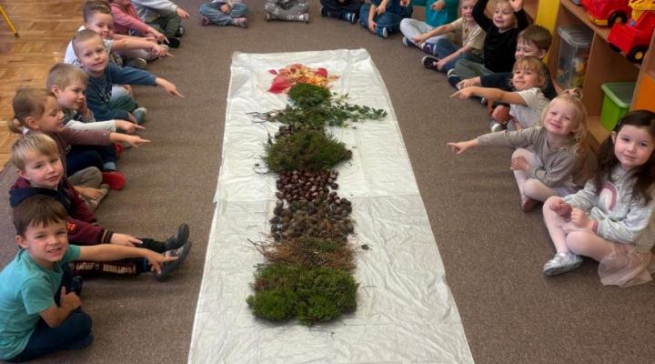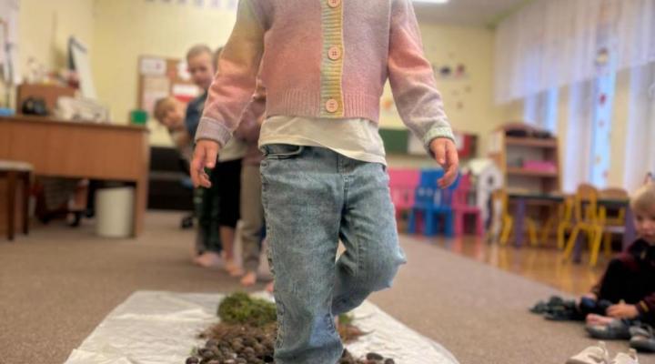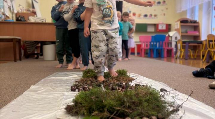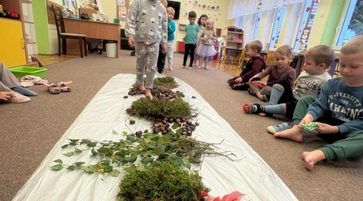Jeżyki wykorzystały dary jesieni i stworzyły jesienną ścieżkę sensoryczną, która składała się z szyszek, kasztanów, liści, igieł sosny oraz mchu.