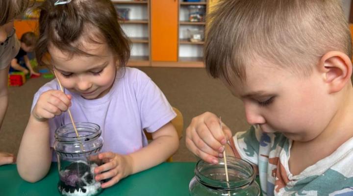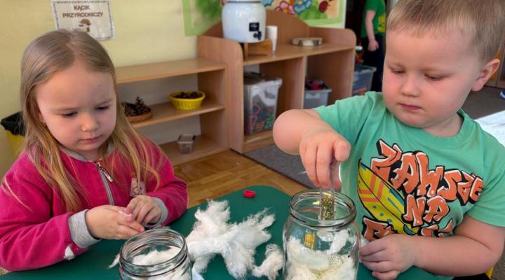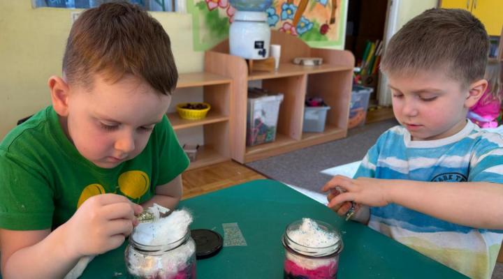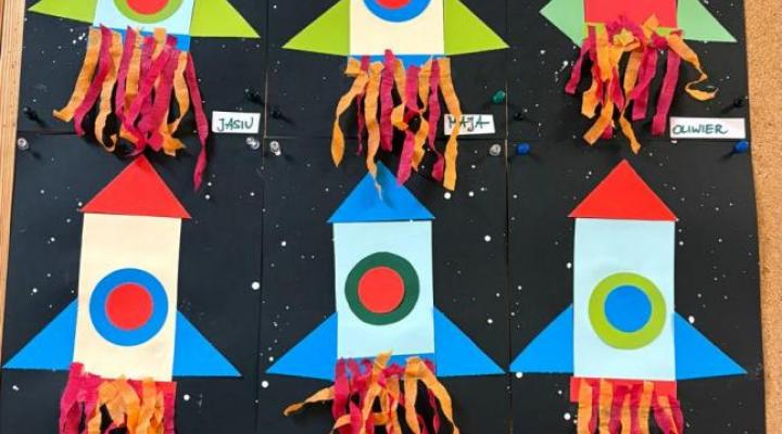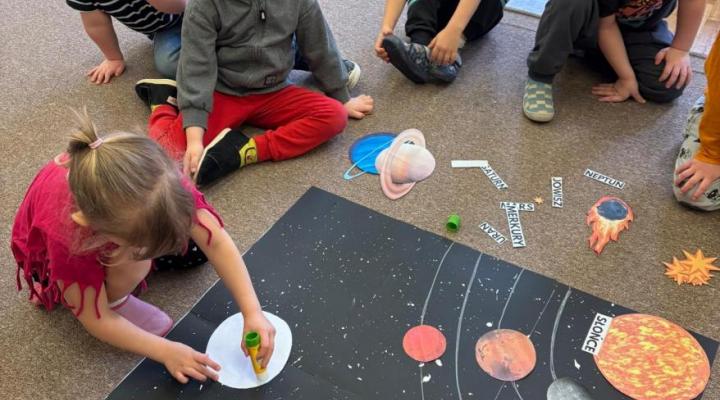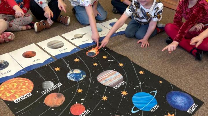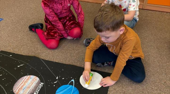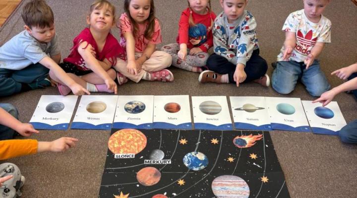 To był kosmiczny tydzień. Podczas zajęć dzieci wzbogacały wiedzę na temat Układu Słonecznego. Poznały pojęcia związane z kosmosem tj. planeta, orbita, kosmonauta, rakieta. Wykonaliśmy wspólną pracę „Układ Słoneczny”. Każde dziecko zrobiło swój „Kosmos w słoiku” oraz pracę plastyczną „Rakieta”.