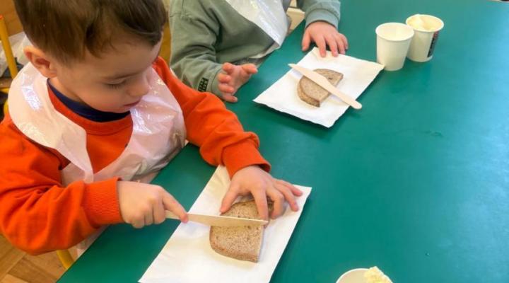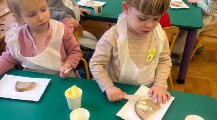Po samodzielnym ubiciu masła, przedszkolaki mogły spróbować powstałej maślanki i świeżego masełka. Samodzielnie posmarowały świeży chlebek i zajadały swoje dzieło