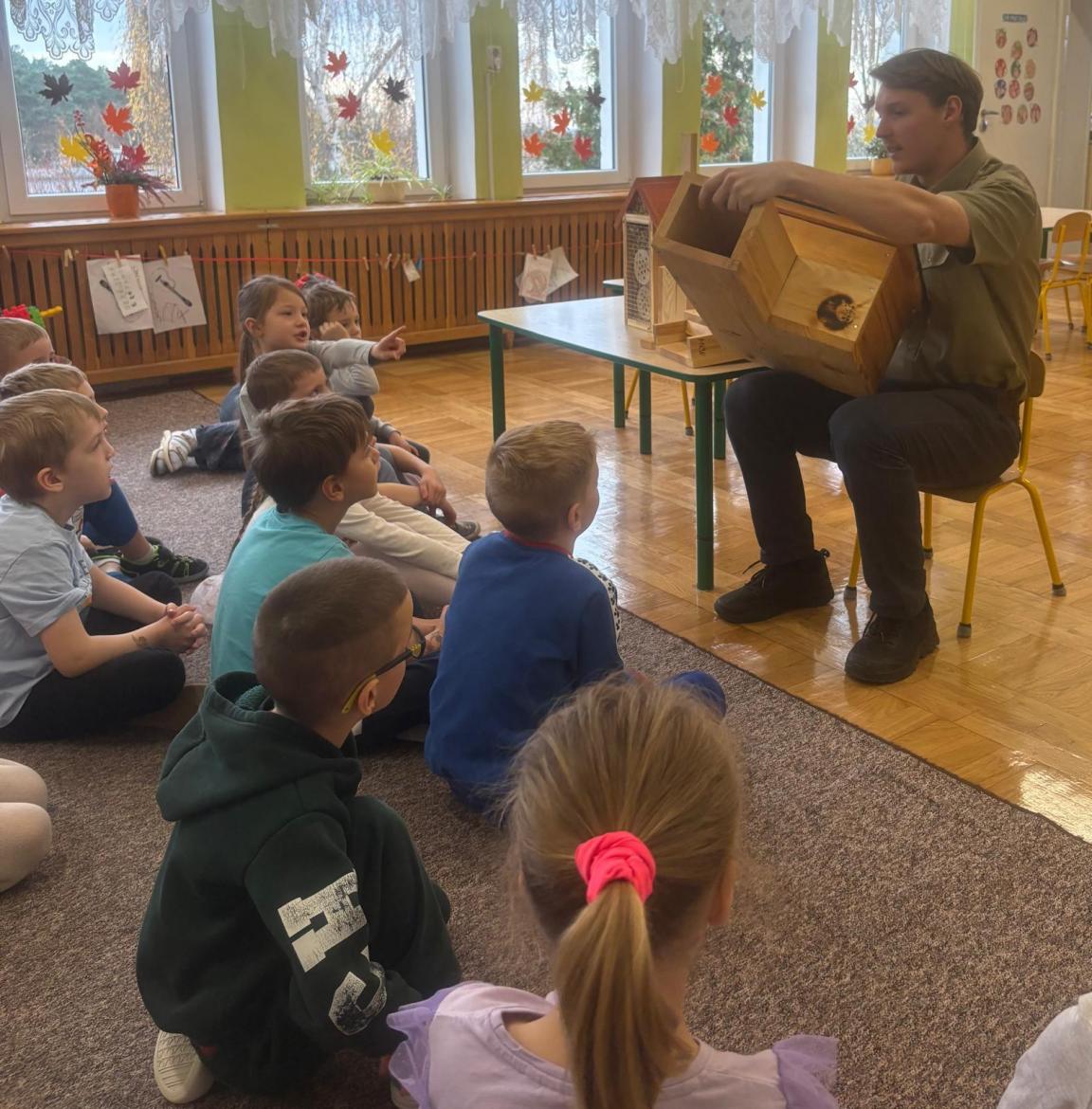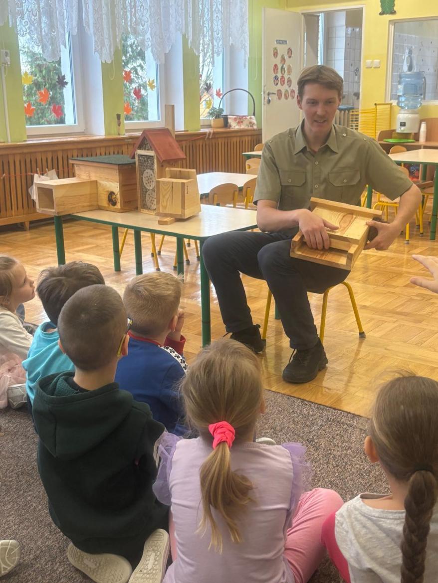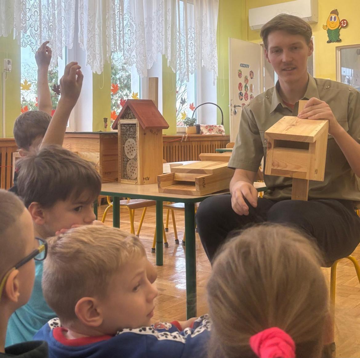 Zwierzęta mają coraz mniej miejsca. Pomóżmy znaleźć im nowy dom. Pan Antoni opowiedział nam gdzie kto zamieszka. Nowe „domki” znalazły miejsce w przedszkolnym ogrodzie.