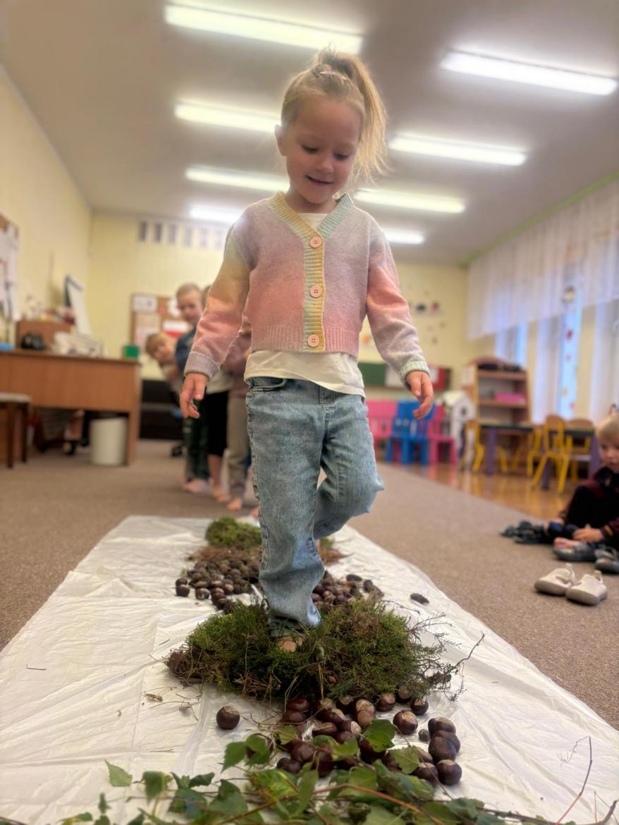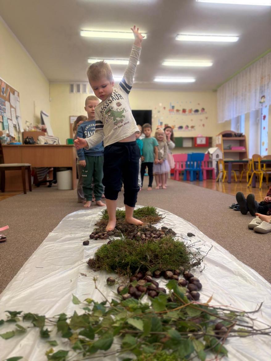Jeżyki wykorzystały dary jesieni i stworzyły jesienną ścieżkę sensoryczną, która składała się z szyszek, kasztanów, liści, igieł sosny oraz mchu.