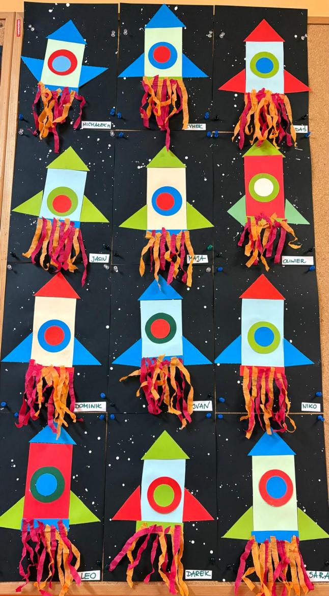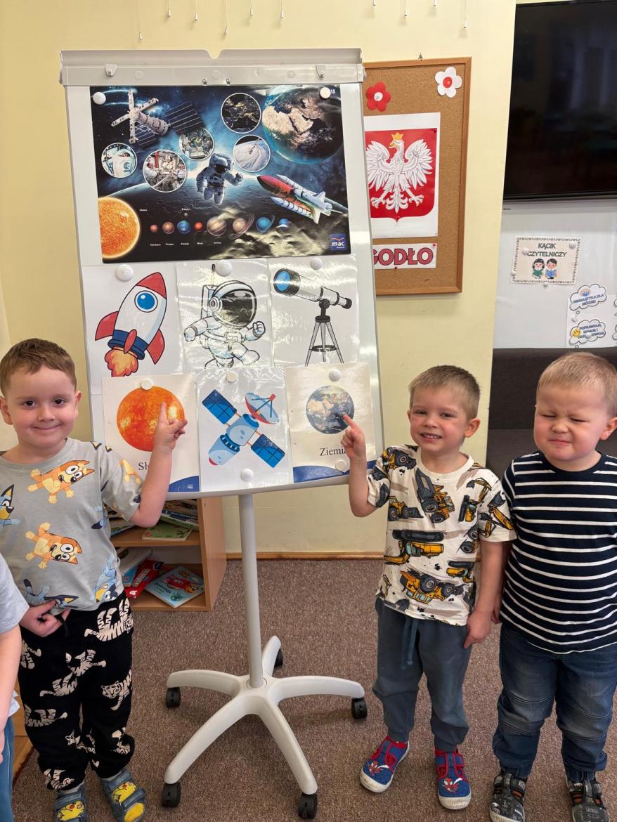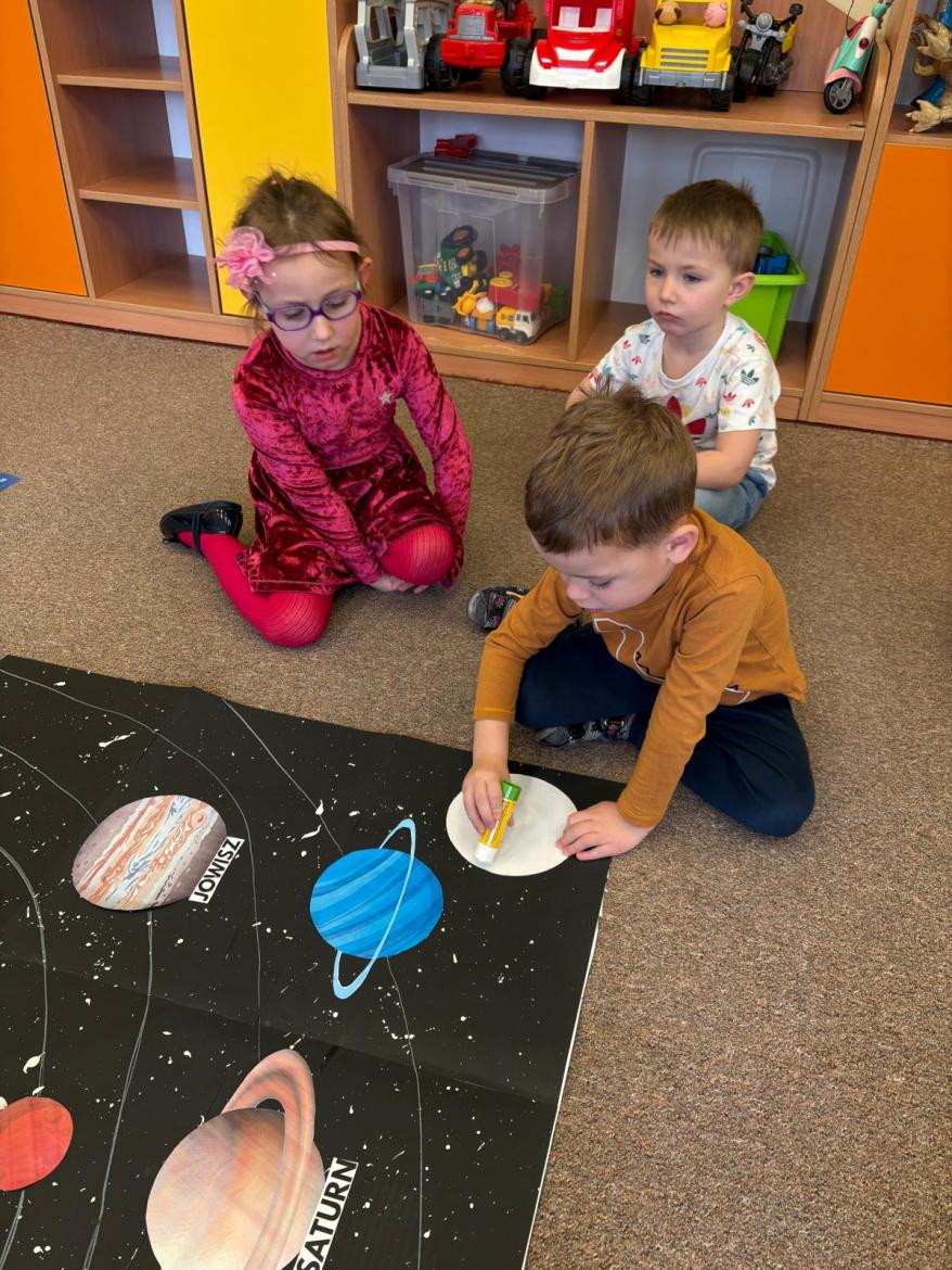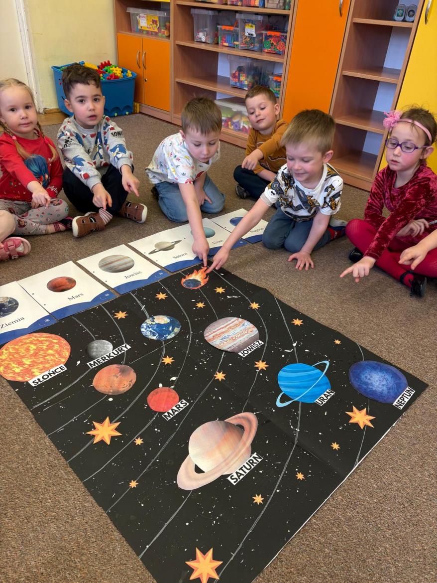 To był kosmiczny tydzień. Podczas zajęć dzieci wzbogacały wiedzę na temat Układu Słonecznego. Poznały pojęcia związane z kosmosem tj. planeta, orbita, kosmonauta, rakieta. Wykonaliśmy wspólną pracę „…