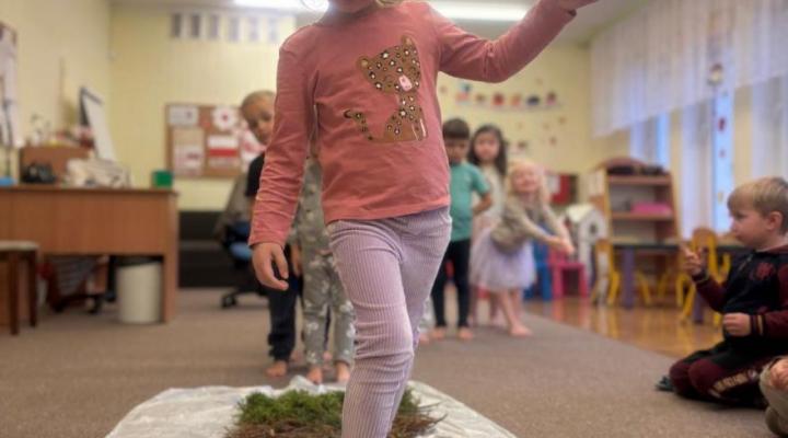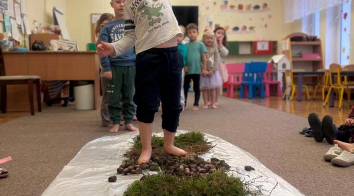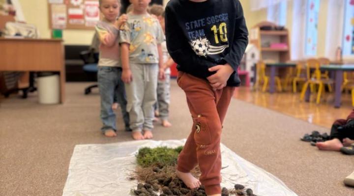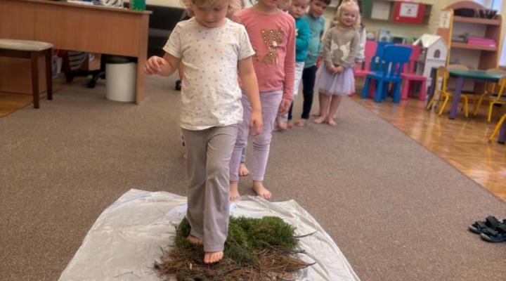 Jeżyki wykorzystały dary jesieni i stworzyły jesienną ścieżkę sensoryczną, która składała się z szyszek, kasztanów, liści, igieł sosny oraz mchu.