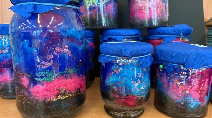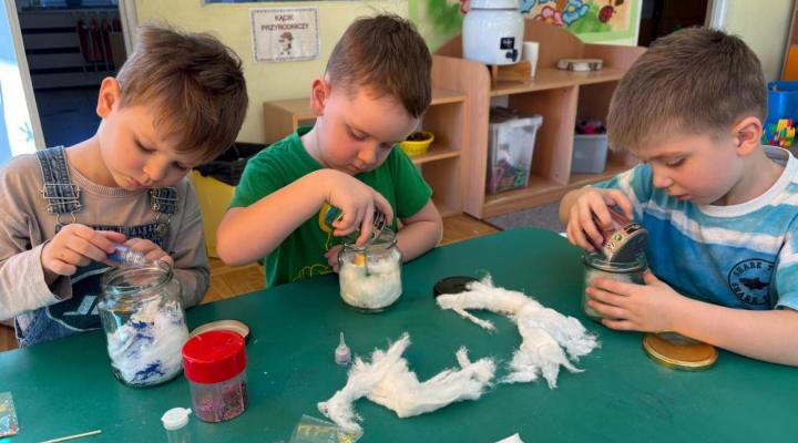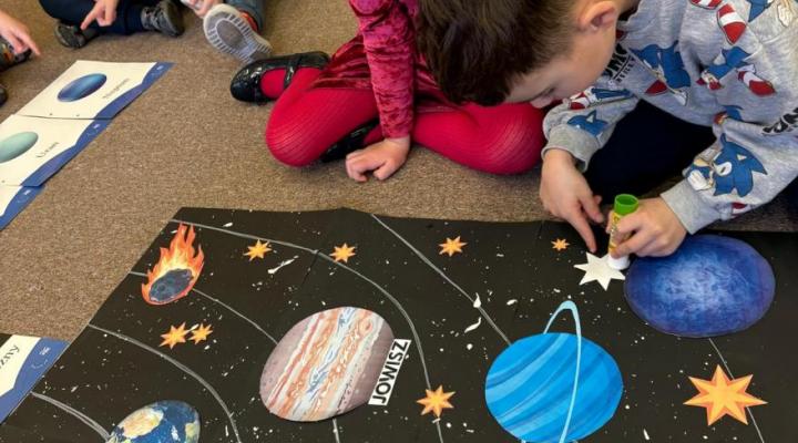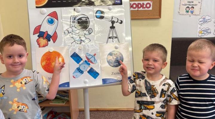 To był kosmiczny tydzień. Podczas zajęć dzieci wzbogacały wiedzę na temat Układu Słonecznego. Poznały pojęcia związane z kosmosem tj. planeta, orbita, kosmonauta, rakieta. Wykonaliśmy wspólną pracę „Układ Słoneczny”. Każde dziecko zrobiło swój „Kosmos w słoiku” oraz pracę plastyczną „Rakieta”.