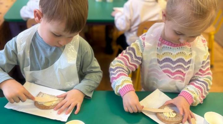 Po samodzielnym ubiciu masła, przedszkolaki mogły spróbować powstałej maślanki i świeżego masełka. Samodzielnie posmarowały świeży chlebek i zajadały swoje dzieło